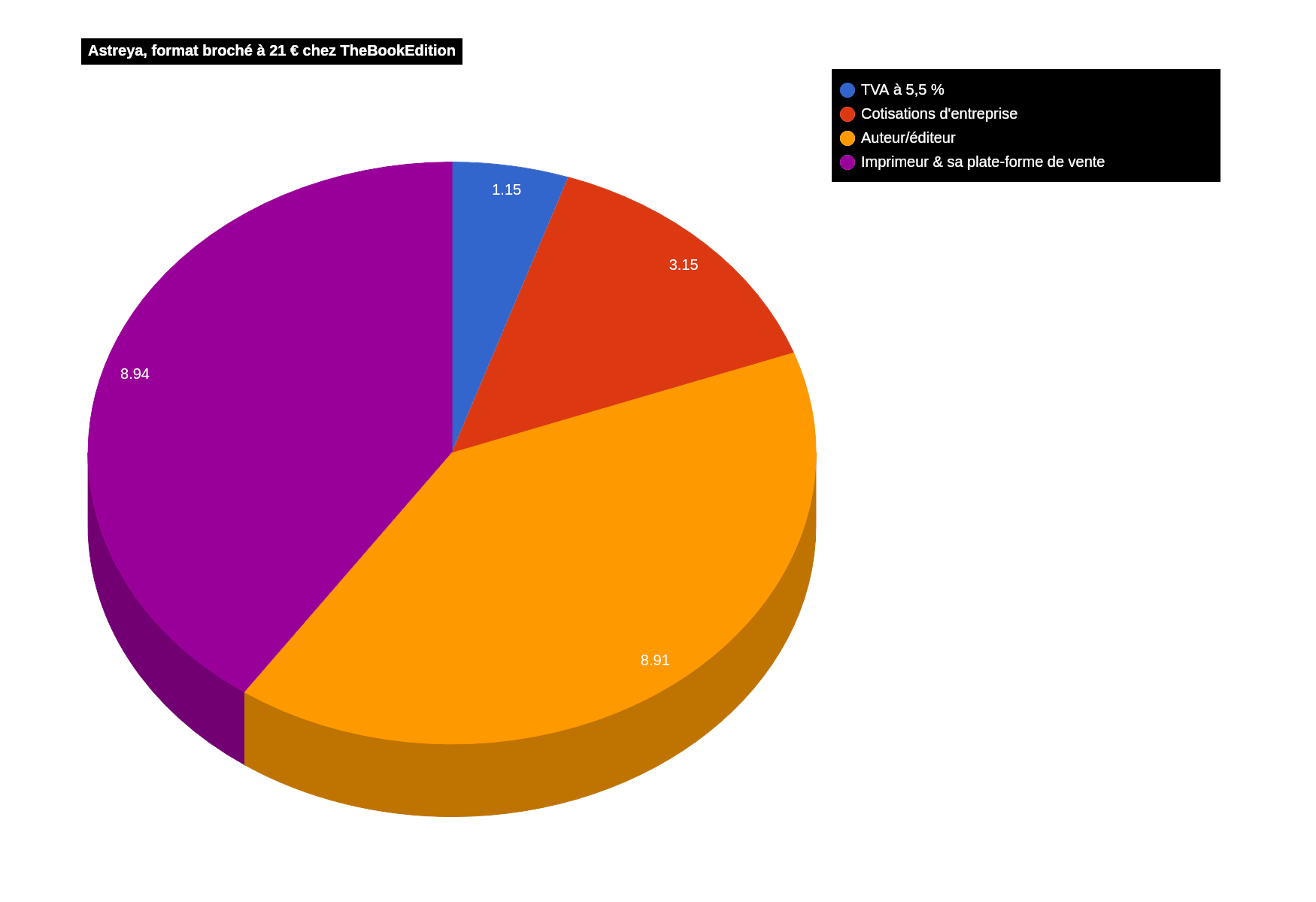 Format papier le plus accessible car disponible dans tous les points de vente, à l'instar du numérique, penchons-nous sur le broché et son nouveau prix de 21 €... Comme précédemment, il faut déduire la TVA française de 5,5 %, soit 1,15 €, et les coûts de commercialisation (distributeur et librairie) de 52 %, soit 10,92 €, pour obtenir le net éditeur, s'élevant ici à 8,94 €. Ici encore, c'est à ce montant qu'il faut retrancher les cotisations de 26,1 %, soit 2,33 €, mais aussi, livre papier oblige, le paiement à l'imprimeur... Il s'agit d'un coût fixe qui dépend des choix de fabrication de l'éditeur (impression à la demande, format, type de papier, de couverture, etc.) et, pour Astreya, chez cet imprimeur, il s'élève à 5,16 € par livre. Reste ainsi, comme je l'avais dit un peu plus haut, 1,45 €, ce qui correspond à 6,9 % du prix de vente TTC.Broché chez TheBookEdition