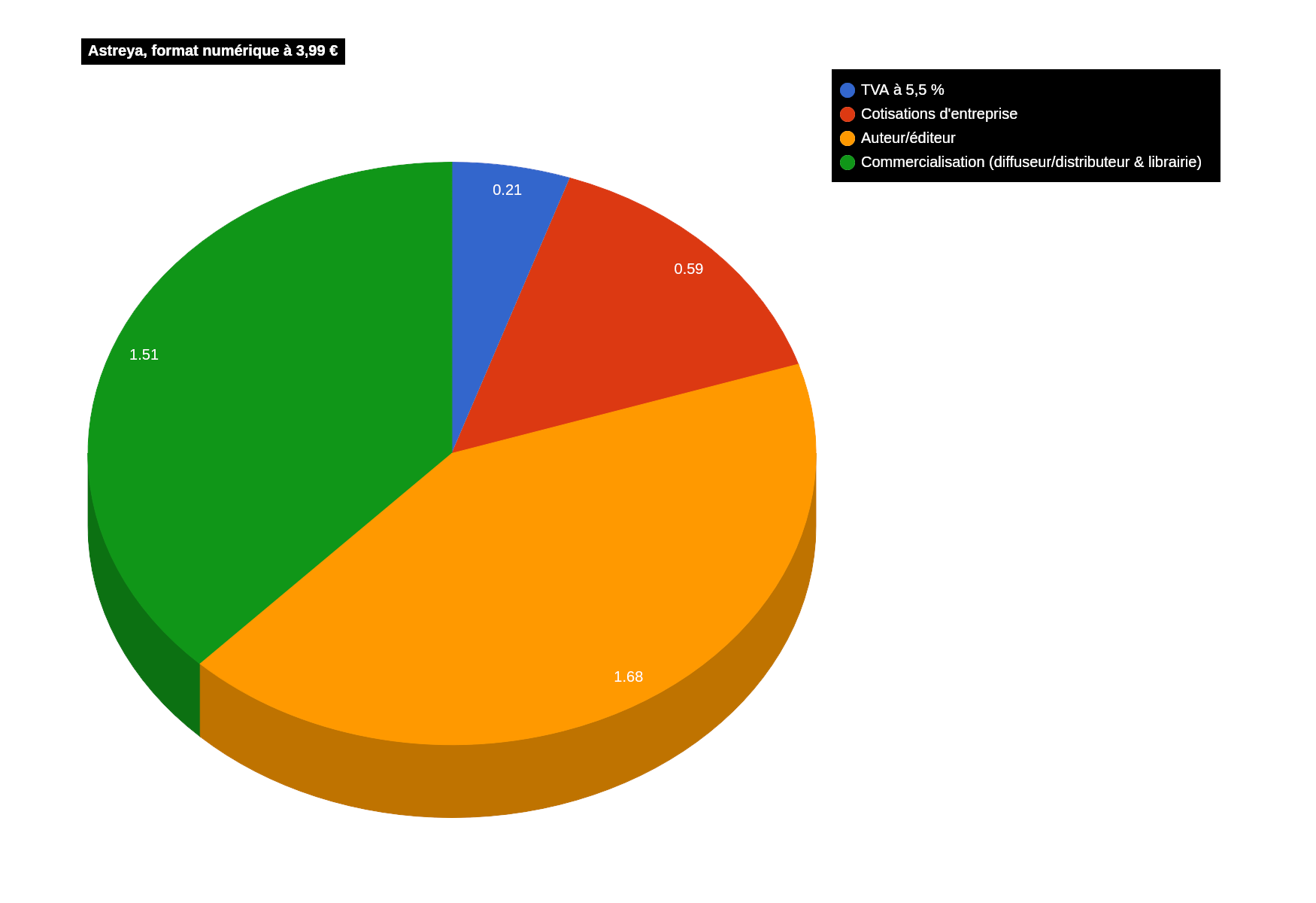 J'avais depuis longtemps le projet de faire un article pour présenter comment se répartissent les recettes de la vente d'un de mes livres, ce changement de prix m'en offre l'occasion... Vous trouverez donc dans cette seconde partie le détail de cette répartition, accompagné de diagrammes circulaires, pour chaque format de mon roman Astreya. Les chiffres ci-dessous prennent en compte la totalité de l'augmentation des cotisations et sont donc valables à compter du 1er janvier 2026...Livre numérique