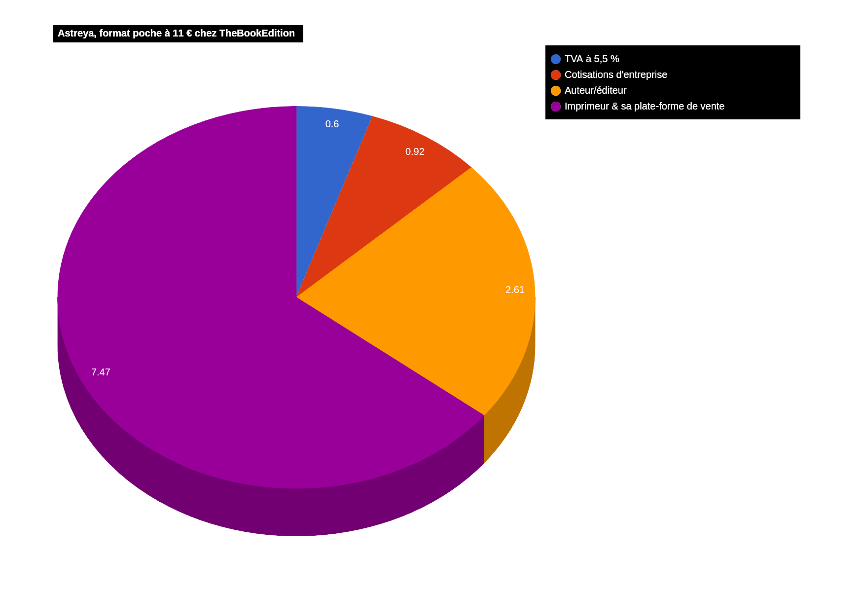 Comme je ne souhaite pas que le format poche remplace le broché (pour ce que j'en ai constaté, ces deux formats s'adressent le plus souvent à deux lectorats différents) et que je ne peux avoir qu'un seul format auprès de mon distributeur papier, le poche n'est disponible que chez TheBookEdition. J'ai fixé le prix de sorte que, malgré les frais de port assez élevés chez ce prestataire, le tout revienne à peu de choses près au même prix que celui du broché avant son augmentation. Ainsi, le tarif du poche est de 11 €. La TVA s'élève à 0,60 € et l'imprimeur prend 7,47 € (64,4 %), me sont donc reversés 3,53 €, auxquels on retranche les 0,92 € de cotisations, et il reste au final 2,61 €, c'est-à-dire 22,5 % du prix de vente TTC.Quoi, c'est tout ?